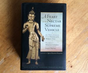 In the 4th century AD, an Indian Buddhist monk named Asanga felt special devotion to Maitreya, and earnestly sought to encounter him. Long story short, he eventually succeeded and met Maitreya in a series of out-of-body experiences in the Tushita heaven. In these encounters Asanga received five dharma texts in verse form. The largest of these is called the Ornament of the Mahayana Sutras, and it is this that forms the basis of A Feast of the Nectar, which is a commentary on Maitreya’s sutra written by Jamgön Mipham (1836–1912), a Tibetan monk and polymath. The hardcover book I’m reading was translated into English by the Padmakara Translation Group and published, very nicely, by Shambhala Publications (not directly connected with Shambhala International).