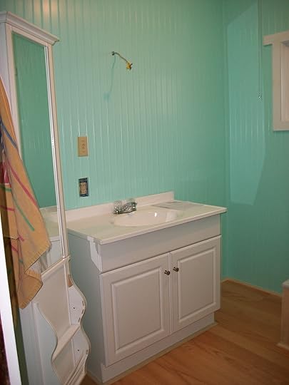 To truly understand the significance of the picture to the left, you would have to have experienced my downstairs bathroom as it has been for the past 20 years. I wish I had a picture. The old bathroom had a barf-pink tub and toilet and an ersatz vanity/sink. The floor was two layers of crumbling linoleum, half of which was peeled off and half of which was kind of barely nailed on. I insisted on a plumbing upgrade when the pipes got so bad I was literally showering with a hose in the milkhouse in the barn, hiding behind the bulk tank and hoping to heck the milktruck didn't pull in. My very pregnant and naked self was not a pretty site. Demi Moore I ain't. During one Thanksgiving, we made our respective parents pee in the lawn because the septic was so bad.