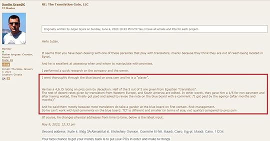 I did further search about the agency’s history and found some concerning information. Apparently someone had similar payment problem in June 2023 and only get paid after the translator posted a negative review in Proz.com. Half of the agency’s glowing 5-star ratings came from Egyptian translators, and less favorable ratings from European and SA translators were edited.