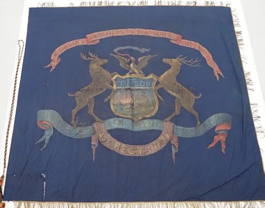 This set of silk regimental colors was carried by the 1st Michigan Infantry at First Bull Run and captured. During the course of the fighting, both color bearers were struck down but the regiment brought the national colors safely from the field.. The flag features elements of the state flag of Michigan with a ribbon for "1st Regt. Infty." The motto Tuebor on the state shield is Latin for 'I will defend." (Michigan Battle Flags)