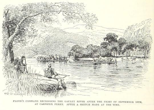 "Floyd's command recrossing the Gauley River After the Fight of September 10th at Carnifex Ferry."They crossed the river and cut thebridge down so that we could not pursue them; this gave them more time to getaway. The guns, ammunition, provisions, and others things we took will amountto $50,000-60,000 and probably a great deal more as they are still bringing thingsin. Our cavalry pursued them and captured a part of their train of wagonstoday, loaded with ammunition, and several wagons filled with dead bodies whichthey were taking away with them. I don’t know what their loss is in killed andwounded but it is a great deal heavier than ours. Our men are still bringing inprisoners and have already brought in a good many. Their force was about 8,000.