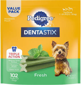 Pedigree Dentastix was selected as second place, for budget. They also have X shaped ridges, and work mechanically.