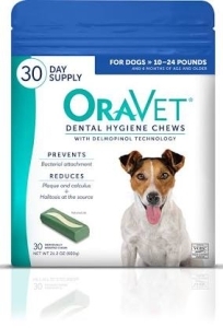 OraVet Hygeine Dental Chews came in third, and were considered a “splurge” item. They do help and I use them for my dogs. They are used once daily and reduce gingivitis, while forming a protective shield to the teeth.