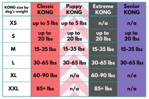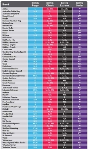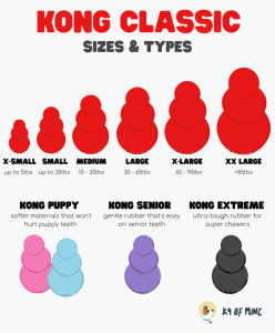 They come in several sizes and degrees of firmness. I generally recommend to select the largest size your dog’s jaw will tolerate, or even erring on the next larger size up than that listed on their chart. They are available as light blue and pink ones which are softer, smaller ones for puppies, red ones for the average chewer, black for the toughest rubber and power chewers, and softer purple ones for older dogs.