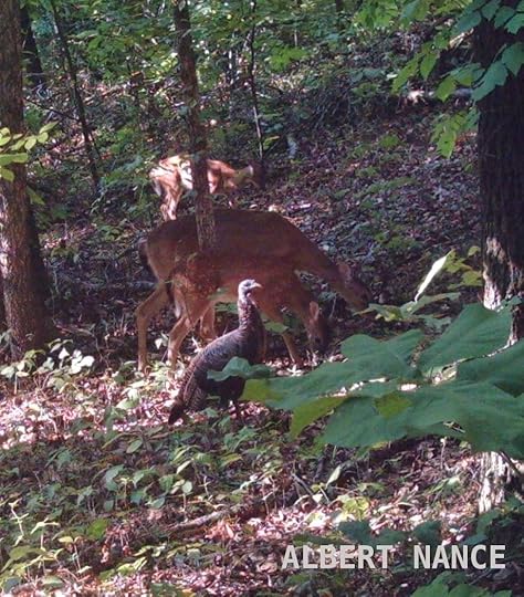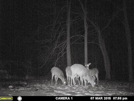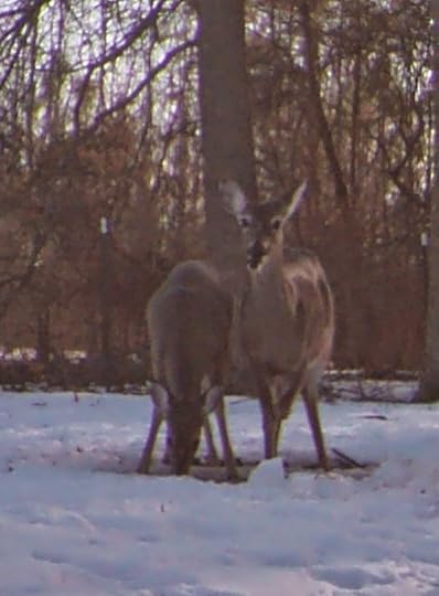 Winter had set in with a vengeance. We had not only terribly cold temperatures but also ice. We had some snow but by then we had six inches of ice. The little animals that live in the wooded area here are stressed to find food. My husband got some bags of corn and began to put out portions out back. It was wonderful. The yard would fill with all kinds of birds in the day. Other times we would see deer coming one by one and then two and finally whole groups for the food they could find when all else was buried in ice.