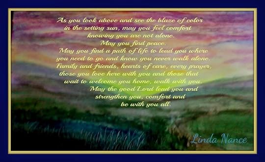 Sinceit took me almost a year to begin this blog I know I will not be ableto do it all tonight but I will be back soon. I had promised to writeas much as I could and as honestly as I could and that I will do. Iwill also finish the book of Art, Words, and Inspirations and the newnovel and so many other things that I have in my head and need to getworked so I can hold them in my hands. I will admit that pain isstill and issue with me. Some days I can hardly sit up but I will notgive up. One day at a time I will live and not just be alive. I am sograteful for all of the wonderful support of family and friends nearand far. I have heard from so many of you and seen when you haveshared my posts and words for me and it means so much. You too havehad a hand helping me to live and feel I have not been forgotten. Youhave helped me to have a voice when I felt to weak to speak formyself. I thank you all. I have felt the love, prayers, cares andsupport. With all of the problems and pain I feel I do not walkalone. The prayers have been heard and I am still here, alive, andnot giving up.