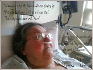 I have seen the world through the window or pictures my husband takes for me of the wildlife that visits in our back yard. Most of the time I have left the house has been for doctors visits, therapy, and occasionally to the store. We used to visit our daughter and family (my precious grandson) often but any travel has been painful and tiring. I worked to gain strength but day by day felt worse. I had caught a cold. That does not sound so bad but for me it is a fear. There is little difference between a simple cold and my lung filling up. I lost all of the upper lobe of my left lung to cancer and have COPD. I hear of so many people my age who all have COPD with some barely having symptoms and others near death. I may not be near death but wanted to keep it that way. I also have some problems with my heart and can quickly build fluids. Day by day it became more difficult to find the bright side of life. There were moments I began to think I was more of a burden in life. I continued to try to gain strength but even going from one room to another was a challenge. I live in a world of pain. That is something that wears on more than the body. This past year I have been undergoing treatments on my back that have help immensely. The bones have deteriorated to the extent that there was not way to stop the pain short of killing the nerves. There pain might be there but lessened in the areas where I could not feel it. We can not deaden with nerve branch blocks my whole spine. This is not only a challenging thing to endure but to accept and realize that bit by bit my body is giving way makes seeing hope for the future difficult. I have wanted to be active on the internet, writing, and the new books I am working on but even sitting in a chair is a challenge. I have wanted for so long to be active in person and not just on the internet and the telephone but have not been able to do it. Even if my health improved it is difficult to find a place to meet we can be sure is available. Those things depressed me but there was more intense problems soon to occur. They can not give me strong pain medications without risking respiratory failure. The pain is so intense that my blood pressure is often dangerously high. The medications for blood pressure can only do so much. I have some wonderful doctors working together to do all that they can for me. The problem is, what more can they do? The 'cold' got worse. The coughing was severe but I kept thinking if I did all I could and took the medications and breathing treatments I would get better. I am pretty tough and have lived through some difficult times. I could do it. I could get better and stronger. I got a prescription of antibiotics and was sure that would make the difference. I had once had pneumonia and coughed so hard I broke a rib. I feared the cold was much more than I wanted to admit. That was one month ago. I had been enjoying the pictures and sites out out back windows. I am working on a book of Art and Words and Inspirations. I am using my paintings, photos and those my family takes to help me. I am excited about it as I think there are so many times I need a happy thought for the day or reminder to never give up and want to share the feeling of hope.