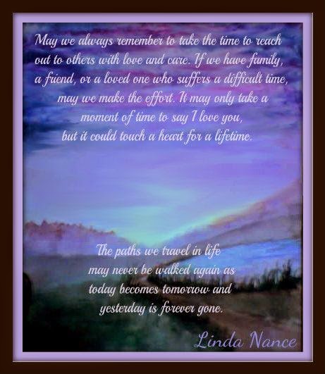 When I wrote the book telling the story of part of my life called I will Not Give Up...Not Today...Life is a Journey ( US http://www.amazon.com/Will-Give-Today-Life-Journey-ebook/dp/B00730UT6A/ref=la_B004PVDVR4_1_3?s=books&ie=UTF8&qid=1412205803&sr=1-3 and UK http://www.amazon.co.uk/Will-Give-Today-Life-Journey-ebook/dp/B00730UT6A/ref=sr_1_3?ie=UTF8&qid=1412205856&sr=8-3&keywords=linda+nance I intended to not just tell about my life or things I had done or plan to do. I wanted to share the thought that as hard as life can become, we can not give up. There may be so much beauty and happiness ahead we would miss if we fail to find ways to reach out in life. I still believe that and have been delighted at the responses to the book. I wanted to write something that could reach beyond the pages and touch or help others. I wanted to be able to use words to share life and created hope.