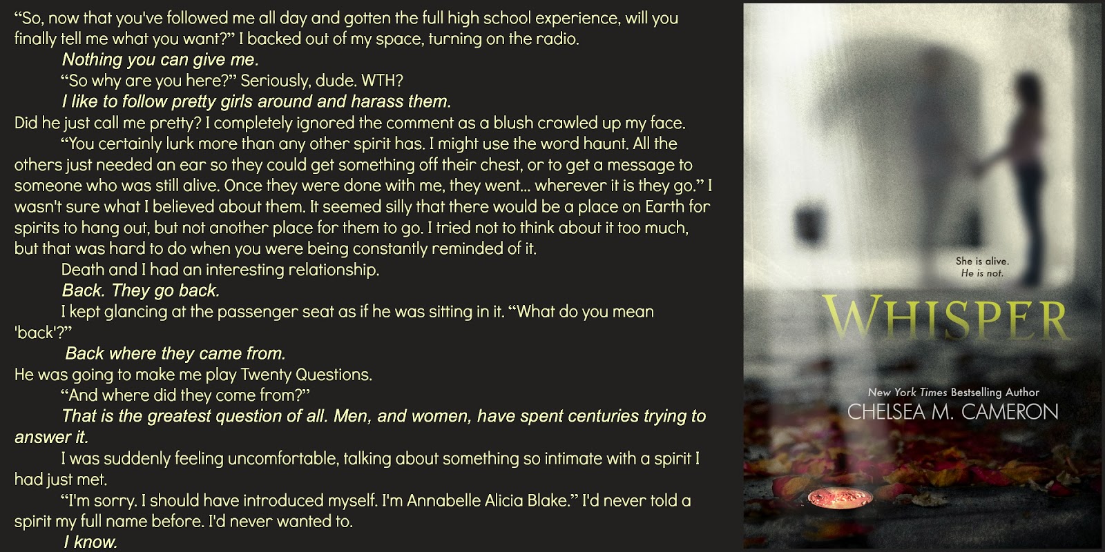 Guys - I read this book awhile ago because once I read the first few pages, I was hooked. I loved it and if you like girl meets ghost stories, I'm sure you will too. When I saw Chelsea was recovering the book, I jumped at the chance to be part of the reveal. So without further ado, I give you:
