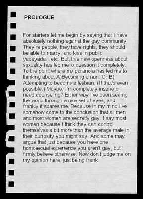 -A woman's biggest fear isn't that her man is cheating. It isn't that her man buys too much porn. It isn't that her man is drinking too much and it isn't that her man is buying prostitutes or gambling away his money or even has an illegitimate child somewhere out there. Their biggest fear is that he is gay . Let's face it ladies. That scares you half to death because well he could already be doing said gay things and you could have some weird disease. OR you are helplessly and irrevocably in love with a man that ONE isn't even attracted to you or TWO has lied and deceived you and possibly used you for god knows how long. OR both. Because if a man is gay and he knows it then he must have you around for mere appearances only. Sad, yes... and if you have kids even more sad.