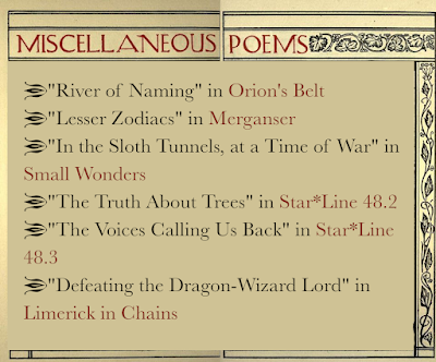 The other three require buying a zine or anthology: "The Truth About Trees" in Star*Line 48.2; "The Voices Calling Us Back" in Star*Line 48.3; and Defeating the Drageon-Wizard Lord" in Limerick in Chains.