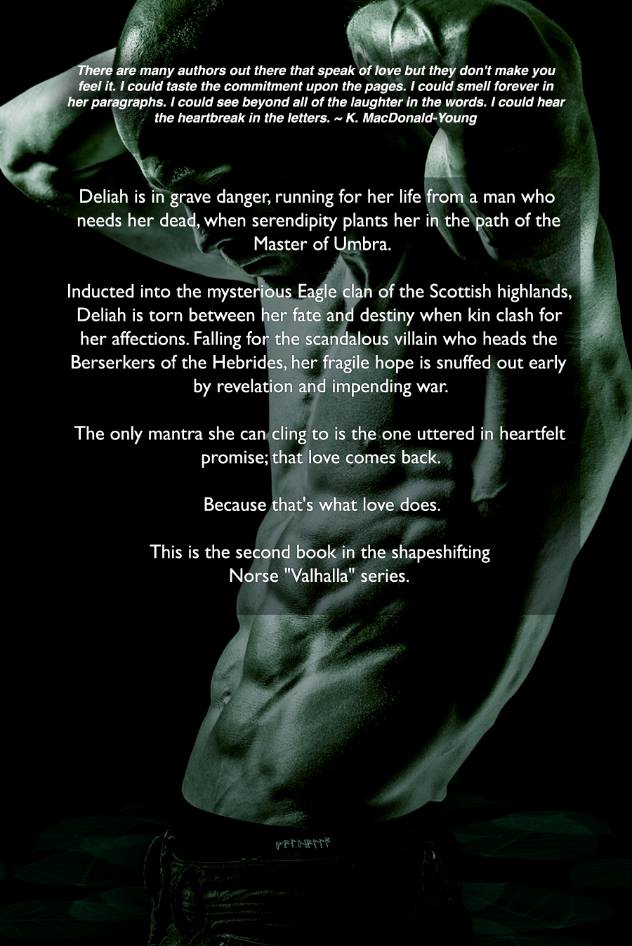 Inducted into the mysterious Eagle clan of the Scottish highlands, Deliah is torn between her fate and destiny when kin clash for her affections. Falling for the scandalous villain who heads the Berserkers of the Hebrides, her fragile hope is snuffed out early by revelation and impending war."