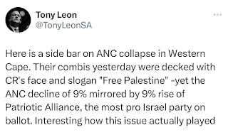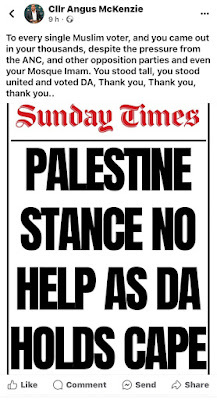I maintain that no believer with even the lightest conscience could havehappily voted ANC. Even a vote for the Zionist DA would have been betterbecause at least they have shown accountability in their governance of the WesternCape, so a vote for them would have been a vote for South Africa , even if itwas a vote against our beloved Palestinian people (yes, that’s an unpopularopinion, and you can lynch me for it later).
