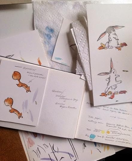 I sometimes photocopy pages from the dummy to test colors -- the paper is not really suited for watercolor painting, but it helps me to see whether the colors I'm envisioning work or not and to try different color combinations: