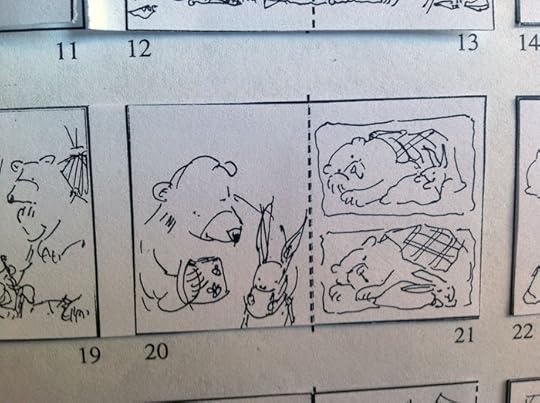 But I did manage to document one spread in detail. It's one of those happy cases where the very first tiny sketch, done for the storyboard, remained basically the same throughout the work. Here it is as a 1 x 2 inch doodle: Beatrice and Bear saying goodnight and going sleep: