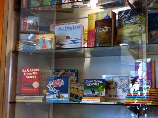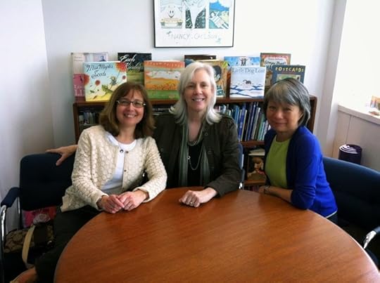 The same was true with Sleepover with Beatrice and Bear. I take a day off from my day job at the library and head off to the train station. The art is all prepared: each spread labeled, covered with mylar, in a sturdy art bag. Once I get to Penn Station it is a quick subway trip and soon I'm standing in the lobby for the offices of Penguin Young Readers Group. There are bookshelves with some of their books displayed, all imprints, and look what I saw on the shelf: