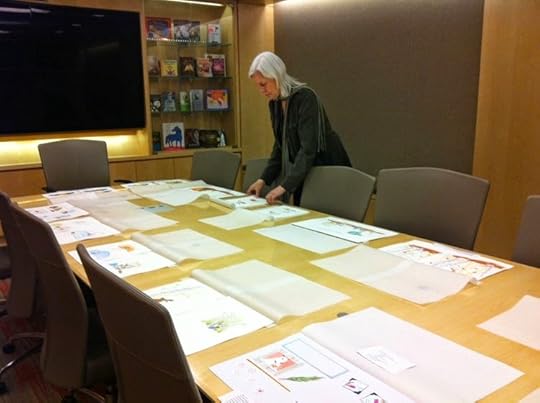 After getting in we head to a conference room and display all the art around a table, so we can see it from page one to page 32. Here are Nancy Paulsen and Cecilia Yung helping me set all the art in sequence on the table: