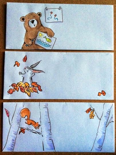Here are three illustrated envelopes with characters from the book: Beatrice, Bear and Squirrel, each hand drawn and painted -- you can own an original! There will be three winners and each will receive one of the envelopes mailed to their door. I'm a big fan of illustrated envelopes and mail art and I hope you are too!