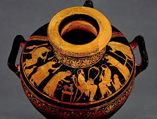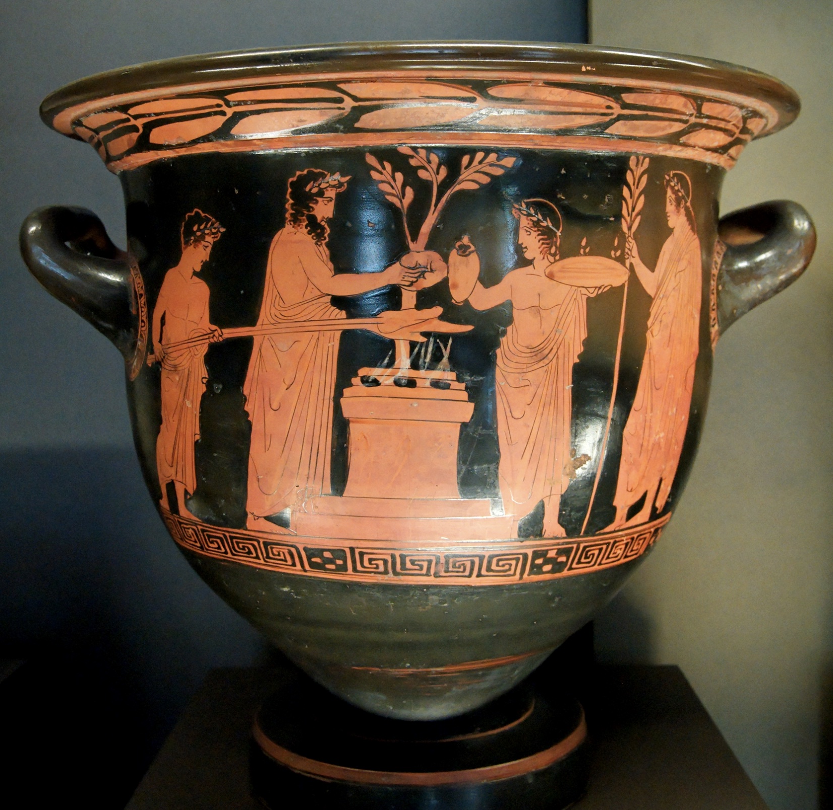 People had jobs then that we do not have today. A charcoal burner made charcoal from wood. A fuller cleaned clothes using urine and sulphur smoke. A fowler caught birds using sticky birdlime smeared on twigs, then sold them to people to eat. Professional mourners were women who helped families grieve their dead by wailing and beating their breasts. An orator was a public speaker, usually an upper class rich man who defended people in law courts for free as part of his career in politics. A sophist was a combination philosopher and orator, like a motivational speaker. A temple priest knew how to sacrifice a live animal and put certain bits on the altars to various gods. A soothsayer would look at the internal organs of a sacrificed animal and tell whether the gods were for or against a certain course of action. This red-figure krater (wine mixing bowl) now in the Louvre shows a priest and his attendants at an altar. The priest seems to be holding an internal organ while one of his helpers pours a libation (drink offering). Another helper is roasting meat over the flames on the altar. Apart from the garlands on their heads, the priest and his attendants wear only cloaks.