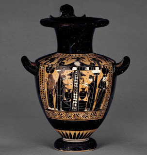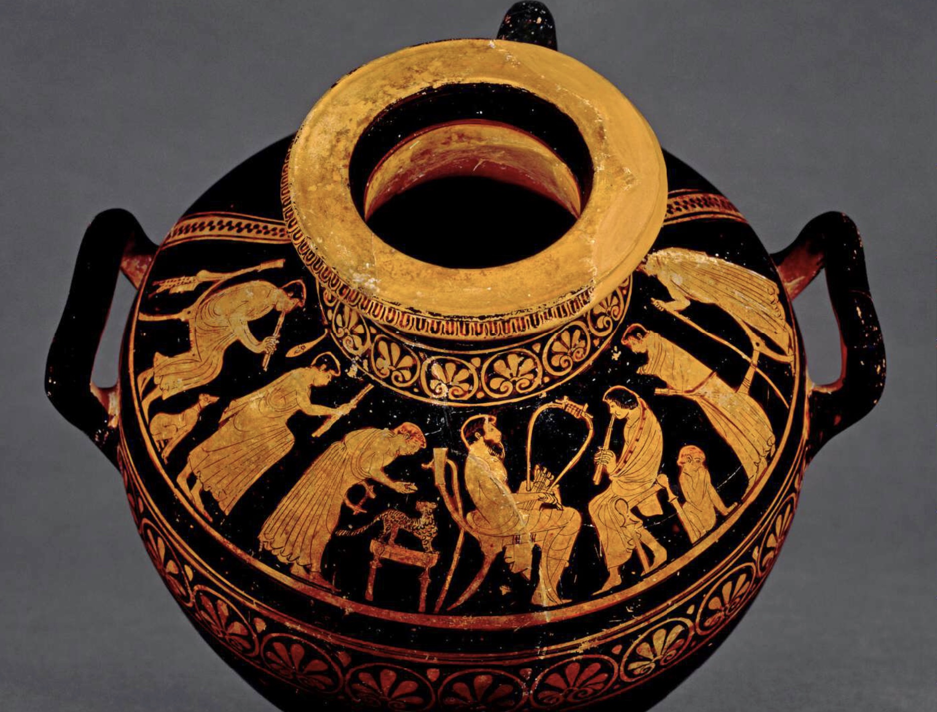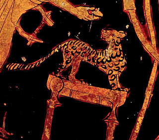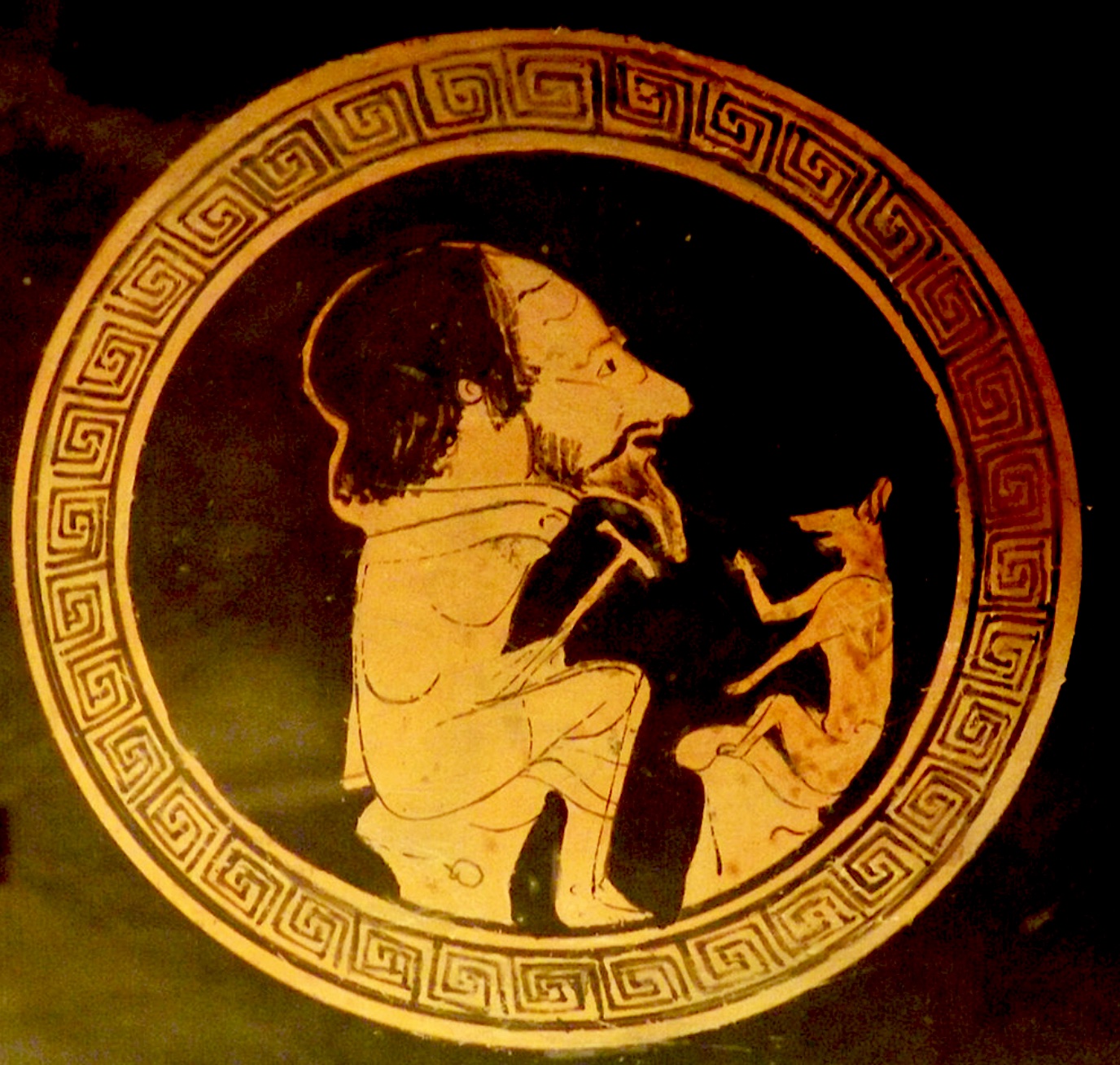 Men and women from all walks of life are mentioned in Aesop’s fables. In addition to the less-well-known professions mentioned above we read of actors, artisans, astrologers, athletes, beekeepers, beggars, blacksmiths, builders, butchers, carpenters, cooks, cowherds, craftsmen, doctors, donkey drivers, executioners, farmers, ferrymen, fortune-tellers, gardeners, goatherds, grooms, hunters, innkeepers, judges, landowners, litter bearers, locust catchers, merchants, millers, musicians, ox drivers, pedlars, ploughmen, potters, robbers, sailors, sculptors, shepherds, shipbuilders, ship-owners, shoemakers, shopkeepers, slave dealers, soldiers, sorceresses, storytellers, tanners, tax-collectors, teachers, tutors, vintners, wall painters and woodcutters. At the lowest level we find many slaves and at the highest are a couple of kings and tyrants. This red-figure hydria (water jar) shows a music teacher giving lessons to young people. Note the pets: a dog and small leopard (not a house cat) listening. Presumably the music entrances them.