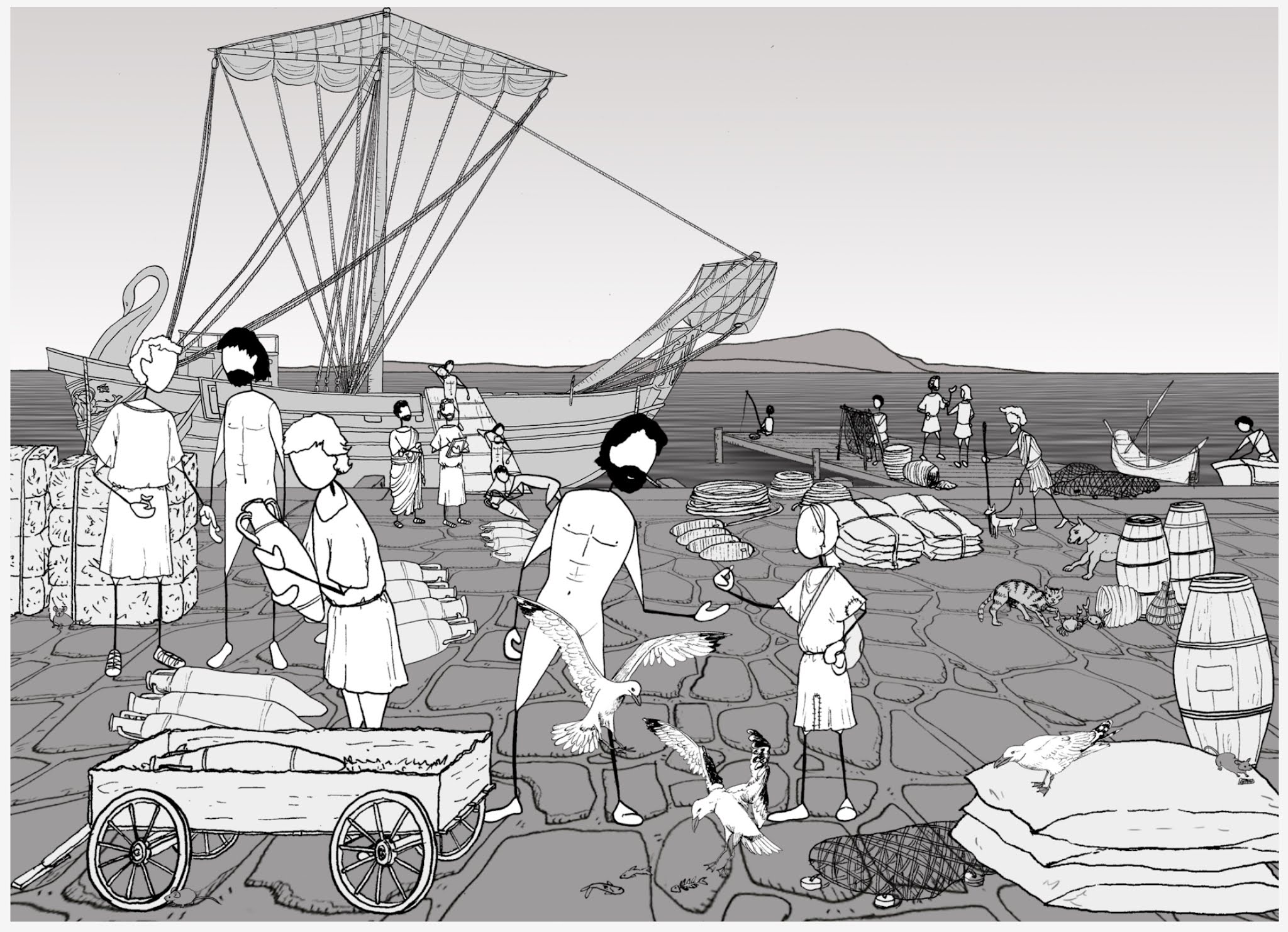 Sophe at Pompeii's port, my fave illustration by Laura Jenkinson-BrownP.P.S. Observant readers will spot that street urchin Sophe resembles Dr. Sophie Hay in certain respects. This was a clever visual tribute by Laura Jenkinson-Brown, who also represents herself as one of the characters. Can you guess which one?