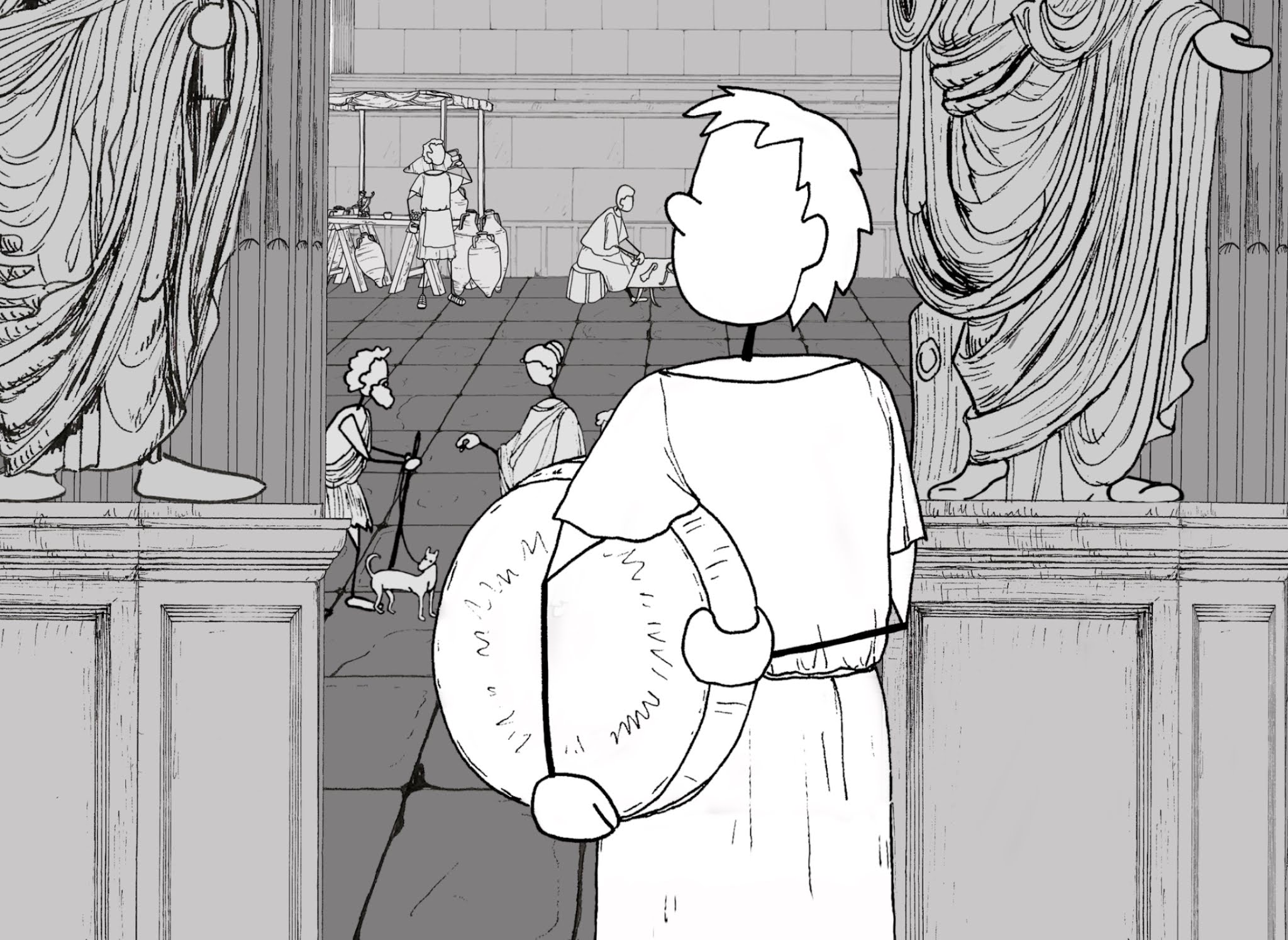 Amarantus with a 'wheel of cheese' by Laura Jenkinson-BrownBecause this story is set in the ‘universe’ of Caecilius, Metella, Quintus et al from the original Cambridge Latin Course book, we decided to put in a few ‘Easter Eggs’. I believe James Watson suggested a cameo by baby Quintus.