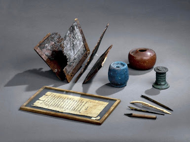 2. Wax-tablet and writing things. Greek and Roman Life room (room 69). I try to make some artefacts a matter of life and death, like a wax-tablet to Lupus, a character from my Roman Mysteries series of books. Lupus is mute and illiterate but as he learns to read and write his wax tablet becomes a vital means of communication. My replica wax tablet smells like honey because of the beeswax on it.