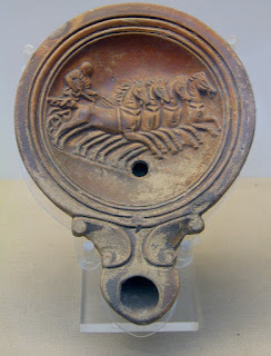 5. Oil-lamps are like snapshots of the ancient world… Many of them also have apotropaic images on them, and the oil-lamps themselves – lights in the darkness – keep away evil. One of my favourite oil-lamps is in the Greek and Roman Life room (room 69) and shows what racing chariots really looked like. I incorporated that knowledge into Roman Mystery 12, The Charioteer from Delphi.