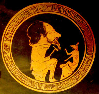 Aesop lived so long ago that some even question his existence. Others say he was born around 620 BCE and died perhaps sixty years later. This is the inside of an ancient Greek kylix (wine cup) now in the Vatican Museum. It shows a bearded man in a cloak apparently conversing with a fox. Because the subject matter is so unusual many have assumed it must show Aesop who told fables about talking animals, especially clever foxes. The first thing we notice about the man – apart from the fact that he is listening to a fox – is his abnormally large head. Most men on Greek vases are usually shown with idealised beauty; this man has wrinkles on his brow, a big nose and a scruffy beard. An ancient biography of Aesop tells that he was hideously ugly and possibly a hunchback like the image at the top of this blog, a small ivory figurine in the British Museum. Maybe that is why on this cup his body is so small in relation to his big head. That may also be why his staff looks like a crutch. This kylix is usually dated to about 460 BC, so if it does show Aesop then it is our earliest representation of him in any form. The first written mention of him is by the historian Herodotus around 425 BCE, at least a generation later.