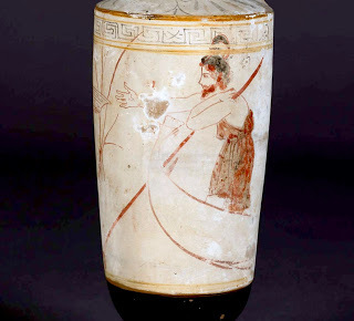 Younger men and those who had to work for a living often wore a tunic instead of a cloak. The tunic, called a chiton, was like a long T-shirt of linen or wool. One type, called the ‘exomis’ left one arm and shoulder uncovered and was favoured by workmen like blacksmiths and potters. Or you could roll down the upper half of your tunic and make it into a kind of kilt. This lekythos (funeral oil-jar) now in the British Museum shows Charon, the ferryman of the dead, in a red exomis and strange crested cap.