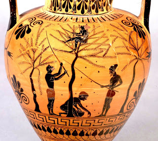 In ancient Greece many men wore no clothes at all, even in public. Working men like fishermen and potters may have gone completely naked. Rich men who had time to exercise often did so naked at a place called the Gymnasium, which comes from the Greek word ‘gymnos’ or ‘naked.’ In sacred games like the Olympics the athletes competed in the nude. Because women mainly stayed in the home, men could run around naked more easily. Imagine the hot Athenian marketplace full of naked men, some of whom wore the T-shirt like tunic or the tablecloth-like cloak. One of my favourite Greek vases, a black-figure amphora (two-handled storage jar) in the British Museum, shows men and boys harvesting olives by beating the tree and shaking the branches. The men wear their purple tunics with the tops rolled down and the boys are naked!