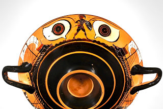 In ancient times, many people believed that when you looked at something, tiny beams made of fiery particles flew out of your eyes. That was how you could see. That’s why Jesus says ‘The lamp of the body is the eye.’ Matt 6:22. If you looked at someone the beams from your eye touched them. If you looked at someone with envy, malice or anger it could hurt them, possibly because your look allowed in evil spirits. That is why people used amulets confusingly called ‘evil eyes’ to reflect back this ‘evil eye’. Such images and amulets are ‘apotropaic’ which means they ‘turn away’ evil. An Evil Eye amulet might have a pictures of eyes or a scary face. The face of Medusa is called the gorgoneion. A scary mask is called a mormolukeion. This kylix in New York is doubly apotropaic. It has medusa on the inside and eyes on the outside so when a drinker raised it to drink the eyes would seem to gaze back, averting any evil spirits or reproachful looks from other diners.