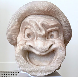 Most ancient Greeks and Romans believed in a world full of gods, demi-gods and spirits. Some were good and some were bad, but they were everywhere. You could distract the malicious spirits with complicated borders on clothes, the sound of bells or nasty smells. You could frighten them away with scary faces or animals. Stone masks like this one from Athens were obviously not worn by actors, nor were the scary masks shown in frescoes and mosaics. They were meant to scare away evil spirits. Amusingly, they were also used to threaten children, like a bogeyman. Ugly Aesop tells a slave dealer that he could be a ‘mormolukeion’ to frighten children into behaving. And later he says he can be a walking talking evil eye.