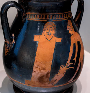 The Greek gods frequently appear in Aesop’s Fables, especially Zeus and Hermes. Zeus is portrayed as a mainly benevolent creator god, like the father of a household. Hermes is his messenger and errand-runner, a bit like a son who is old enough to drive. The name Hermes is naturally linked to the word ‘herma’ which was a square pillar of stone used to mark boundaries and crossroads and protect them against evil. Sometimes the carved stone head of a deified hero like Heracles or the god Hermes was placed on top of these herms to make them even more protective. This pelike (jug) now in Berlin shows a young man bringing a pig to a herm. An image of your favourite god or hero might also protect your house from evil. In Aesop we see people buying statuettes of gods to put in their homes. They would lay an offering such as a candle, cake or flower in front of the statue. They might also pour a libation, a little bit of wine or oil, at its feet or at the base of the altar or niche in which it stood.