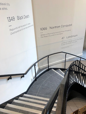 Stairs at City Wall at Vine StreetWhereas the black marble stairs at London’s Mithraeum (top photo) plunge you down into a suitably murky underground temple that Romans called a ‘cave’, the installation here is the opposite. It is light, bright and spacious. I first went in May of 2023, and again in July. After the seething summer crowds at the Tower of London and the British Museum it was a joy to have this airy, echoing space all to myself.