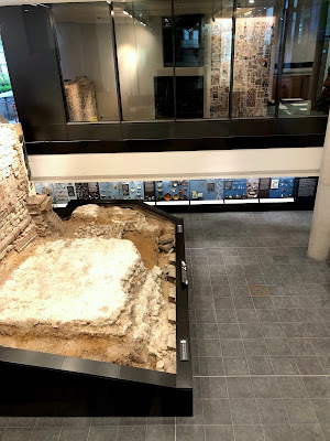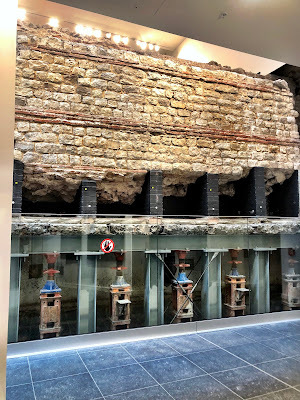 In the late 1970s I visited London as a student. I still remember seeing smart city businessmen in bowler hats walking on the same pavement as girls in mini-skirts and hippies. I imagine them now, stopping to watch the demolition of the old Metropolitan Bonded Warehouse just around the time of my visit. (A tiny blue bead in one of the final cases might have been dropped by a hippie.) By now the wall had been completely swallowed by the rising street level so those 1970s businessmen and hippies had nothing to see. However builders found this bit of wall in the basement of the warehouse, and in 1979 they stopped construction long enough to let archaeologists excavate.
