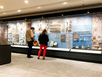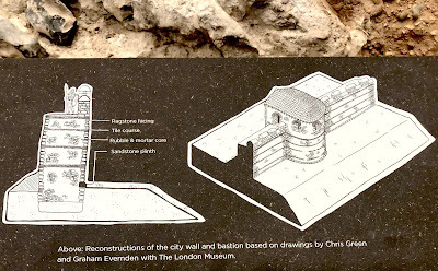 A cross section of London's Roman wall with bastionThe glass case shows us bits of amphorae, heating flues and food preparation bowls. I imagine burly sailors bringing the amphorae full of olive oil and wine from ship to city gate; a fish-sauce merchant from North Africa pressing his bare hands to the plaster wall warmed by a hypocaust on a winter day; the Germanic wife of a retired soldier grinding spelt for bread.