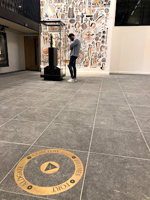 A compass in the floor and artwork on the wallUnlike the hero of my Time Travel Diaries book, I didn’t have to be decontaminated and debriefed after my visit to the past. When I came up the stairs through the exit, I found a delightful little coffee shop called Senzo. Tables on a mezzanine allow you to sip a fairtrade cappuccino and gaze down on the Roman wall and its artefacts, pondering what you have just seen.