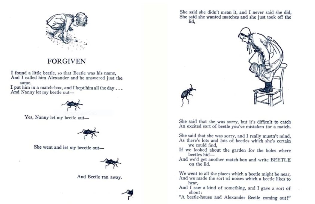 When I was around six, my mom read to me Now We Are Six, and it was then that she filled me in on the story of my name. In that book is a poem called “Forgiven” and in the poem is a beetle (who I mixed up with The Beatles, naturally) and the Beetle’s name is Alexander Beetle.