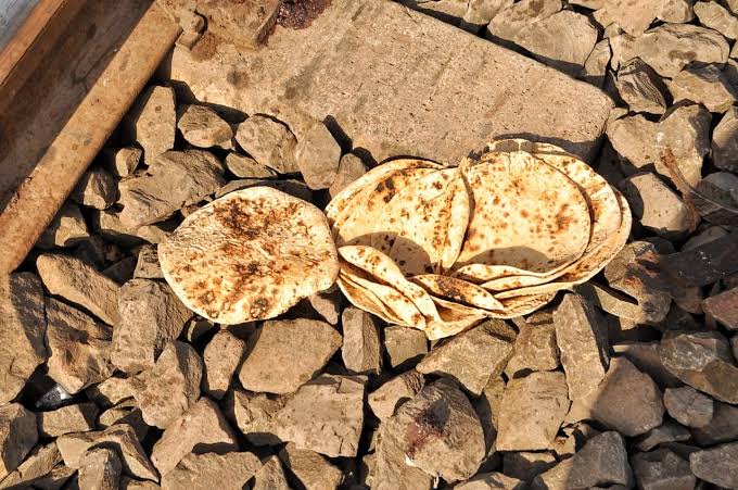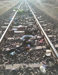 কিছু পোড়া রুটি পরে আছে রেললাইন এর ট্র্যাকে,