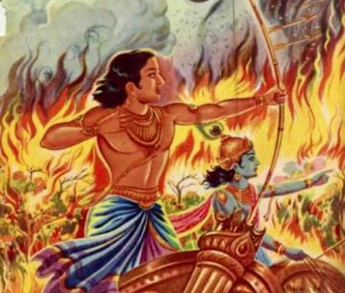 Now , one night suddenly a chariot appears on the edge of the Khandava forest. Inside the chariot are 2 persons , one is Lord Vishnu or Sri Krishna , let's think of another very powerful man in modern India.The other person is Arjun , a young , motivated follower of Sri Krishna , you can draw his simile to any follower but very motivated , enigmatic , highly skilled , and going up the ladders very fast , and all eyes are on him. On the instruction of Sri Krishna , Arjun burns down the whole forest , the whole Khandava forest.Why ?
