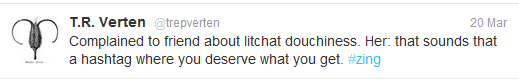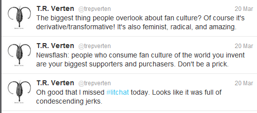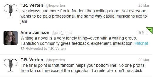 I’m glad I missed it, in retrospect, because it led to me getting mighty angry and writing a bunch of tweets into space about the snooty attitude of “real” writers (and I’ll keep that in scare quotes, thank you very much) towards fic.*