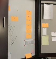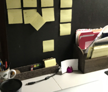 a flat surface sufficient to hold one laptop computer, an upright organizer, bottle of water, notepad, ipad and a cup with pens and other oddments. the back side of a bookcase for sticky note to-do-lista planning board (with multiple planning modes)cubbiesa writer