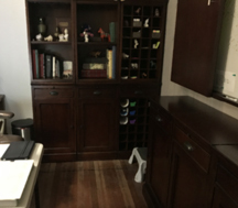 Along one display wall stood a set of wall cabinets, solid wood, cherry finish, near new condition: five bottoms with doors and drawers, two uppers with shelves, one each with cubbies (aka wine bottle slots); let's call them cubbies.