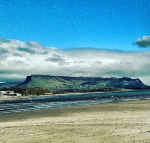 We stayed close to the town of Sligo, situated on the west coast just below Donegal and not too far from the border of Northern Ireland. The landscape here is magnificent, with breathtaking cliffs and crashing surf and mountains that seem to pop up out of nowhere. Here we are on Lissadell Strand (beach), not far from where W.B. Yeats is buried. You can see beautiful Benbulben in the background.