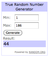 So sorry for the delay in announcing the winner of the giveaway. Better late than never, right? By the end of the giveaway I had 186 followers on my Emerald City Facebook page. Woo hoo! Thanks, everyone! I used Random.org to generate a random number for me, and here are the results: