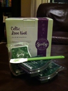 Do you love good smells as much as I do? Do you love the color green as much as I do? Well, if so, you’re in luck. Because I have in my possession a brand new gorgeous green Celtic Love Knot Scentsy warmer with three Festival of Trees bars to go in it, and a little wax-remover spatula, all donated by my dear friend Julie in honor of my book. It goes so perfectly with the theme, set in the city of pine!