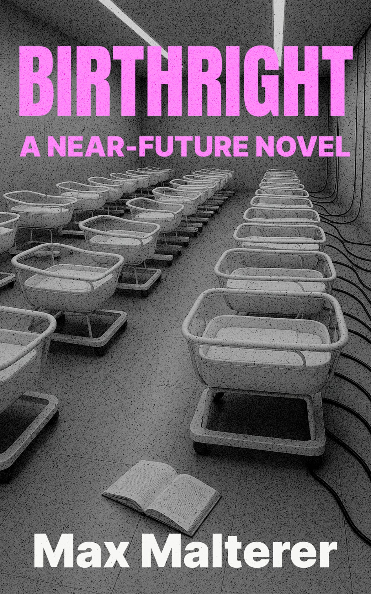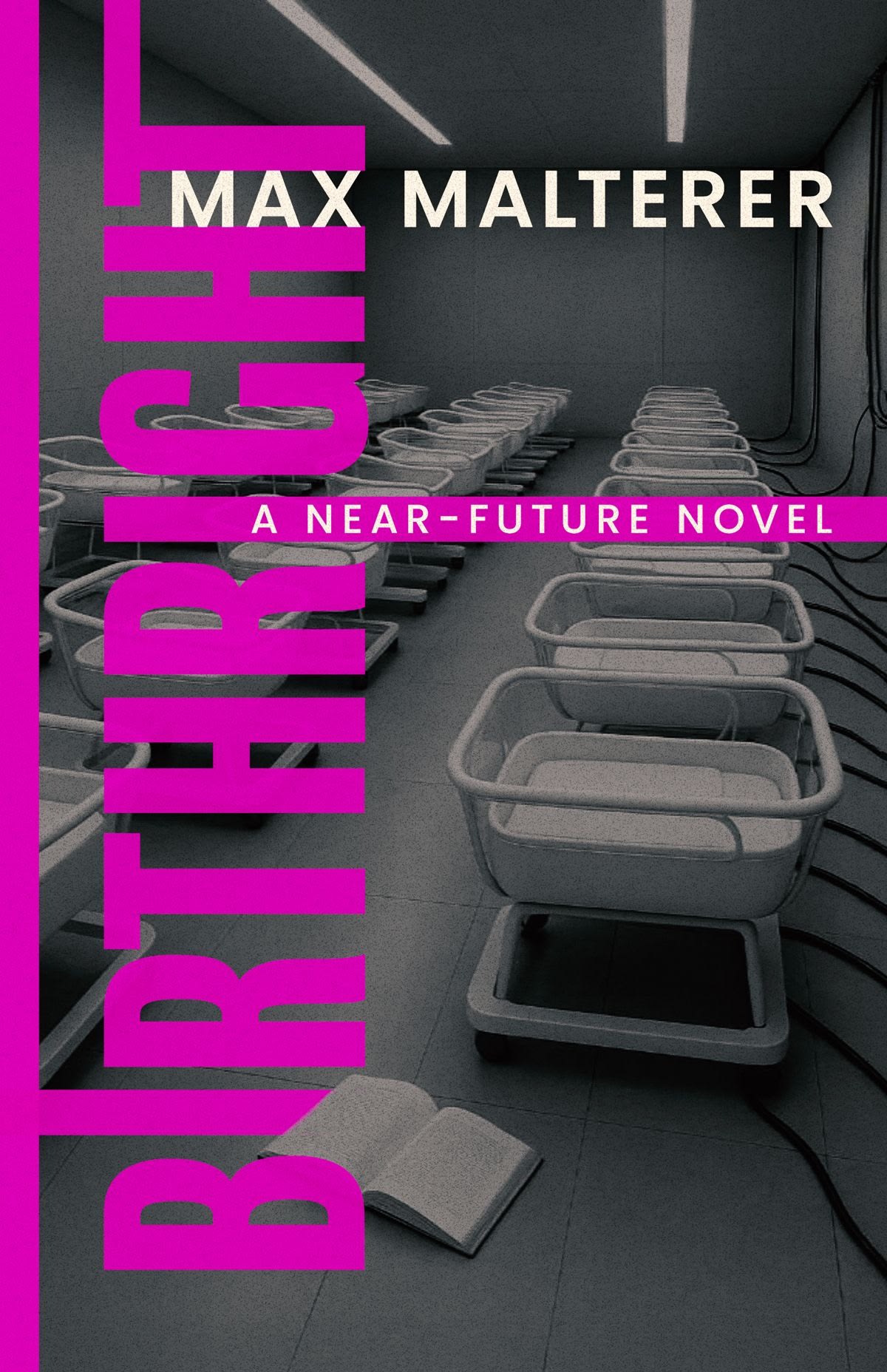 So when I began working on Birthright, I combined that visual language with an image I’d had in my head for a long time — empty, futuristic cradles in a sterile room. Bright typography. Very striking.