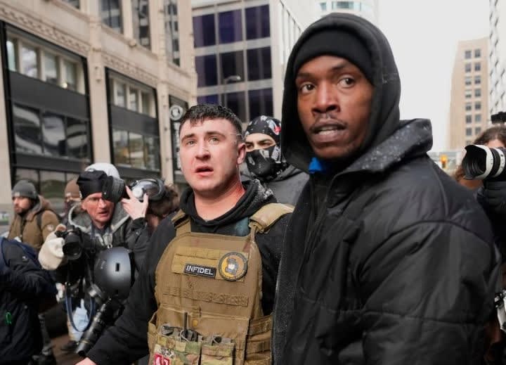 There’s no telling what might have happened next if Isaiah Blackwell, a 30-year-old Black man, had not put his body between Lang and the counterprotesters. Blackwell stood face to face with Lang, shielding him from further attack. He then led Lang away from City Hall, at times acting as a blocker clearing a path of escape, other times clutching him by one arm or guiding him from behind with hands on his shoulders. “Don’t touch him, let him go,” he cried. Lang made it to a nearby hotel.
