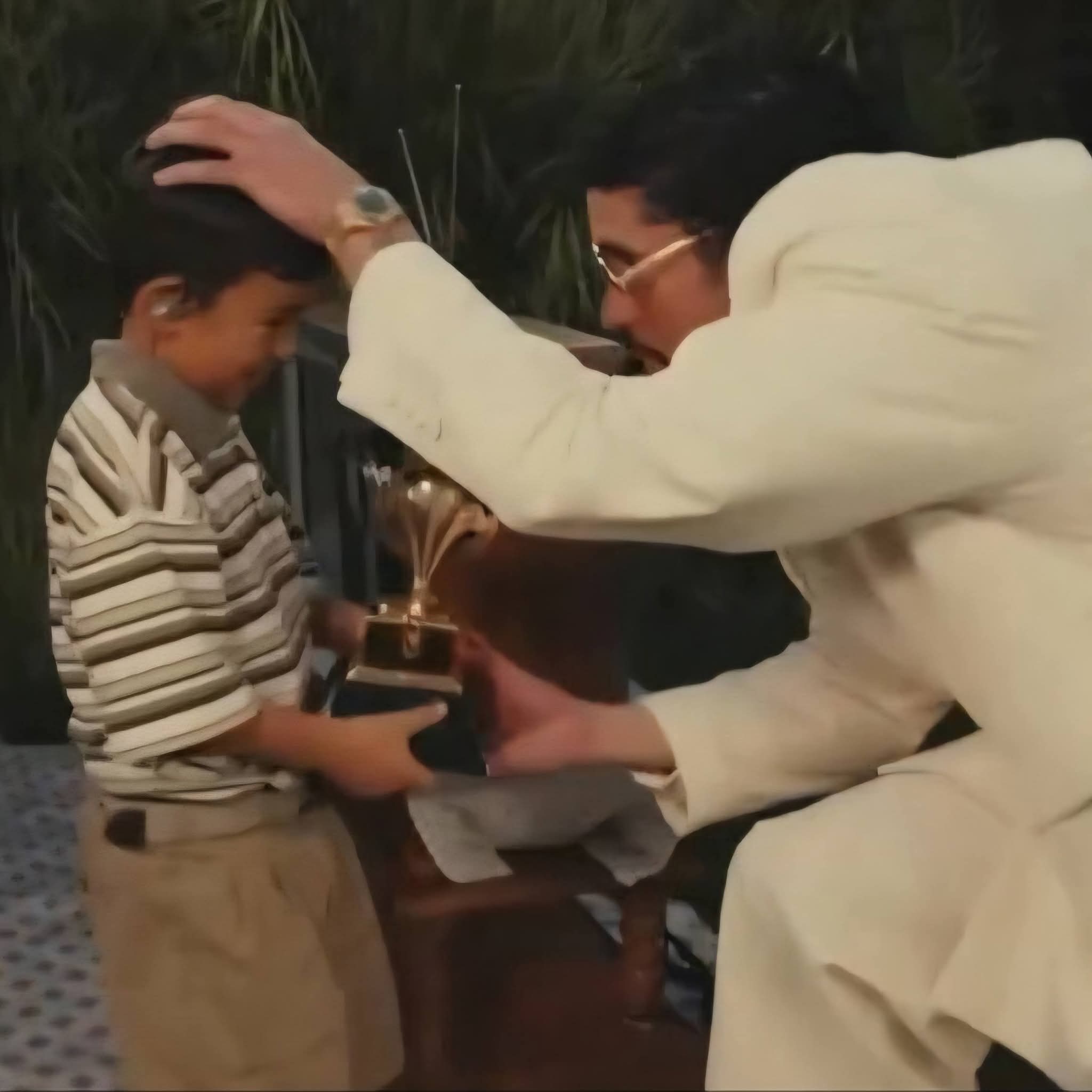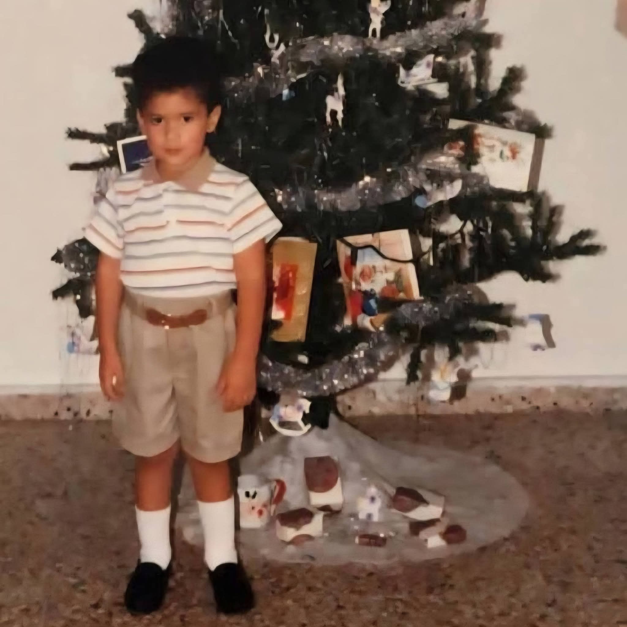 The actor in this scene, half-Argentinian Lincoln Fox, was dressed exactly how a young Benito Antonio Martínez Ocasio looked standing in front of his family’s Christmas tree, wearing a striped collared shirt and khaki shorts.